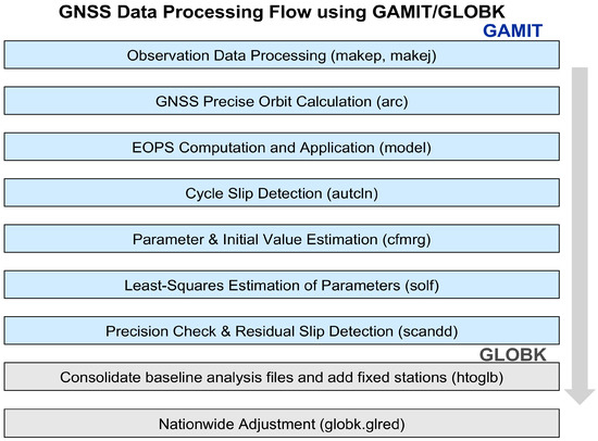 The GAMIT/GLOBK processing workflow follows a structured and modular sequence that begins with the formatting of raw GNSS observations and ends with a finalized, statistically validated geodetic network solution. GAMIT modules—such as makej, arc, cfmrg, and solf—perform critical tasks including data preprocessing, modeling of satellite geometry and atmospheric delays, resolution of carrier phase ambiguities, and baseline estimation. Subsequently, GLOBK modules—such as htoglb and glred—integrate these solutions over time, apply robust weighting strategies, and stabilize network parameters through Kalman filtering and reference frame alignment. At each stage, the workflow incorporates automated quality control mechanisms, such as cycle-slip detection, residual analysis, and model misfit diagnostics [13,44,46,47]. Figure 3 illustrates this sequential data flow, emphasizing the systematic design of the software and its emphasis on rigorous statistical filtering to ensure that only high-quality data contribute to the final geodetic solution.