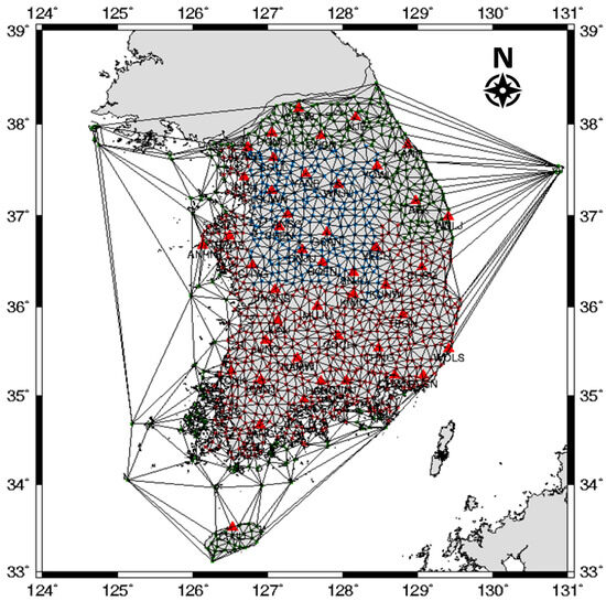 The nationwide geodetic network adjustment was conducted using the GAMIT/GLOBK software suite, referencing the International Terrestrial Reference Frame 2014 (ITRF2014) at the reference epoch of 2002.0. While this epoch coincides with that of Korea’s official geodetic datum (KGD2002), which is aligned with ITRF2000, the present study adopts a more recent and precise realization of the global reference system. All fixed CORS stations were referenced to ITRF2014 coordinates, ensuring enhanced positional consistency aligned with international geodetic standards.