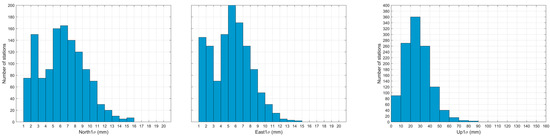 A statistical summary of the adjustment results is presented in Table 7. The analysis confirms that the unified adjustment framework achieves sub-centimeter RMSE in the horizontal directions while maintaining spatial consistency and statistical reliability across the national geodetic control network. Among the three coordinate components, the vertical direction (up) exhibits the largest root mean square error (RMSE) and standard deviation, which is a well-known limitation of GNSS-based height estimation due to satellite geometry constraints. In contrast, the east and north components show very small standard deviations—1.25 cm and 1.18 cm, respectively—and average residuals below 1 cm. However, all three components include exceptionally large maximum residuals, reaching 85.69 cm (east), 81.09 cm (north), and 4826.36 cm (up). These extreme values are primarily attributed to a small number of control points that were physically relocated during the observation period from 2008 to 2021. The dataset consists of approximately 5500 control stations, observed intermittently every 2 to 3 years. While most stations remained stable and continued to function as part of Korea’s long-term geodetic framework, a few were inevitably reinstalled at nearby locations, leading to significant outliers in both horizontal and vertical components. To minimize the influence of these outliers and to more precisely evaluate the internal consistency of the adjustment, a 3-sigma outlier filtering was applied. The residual distributions in the east, north, and up directions are illustrated in Figure 11.