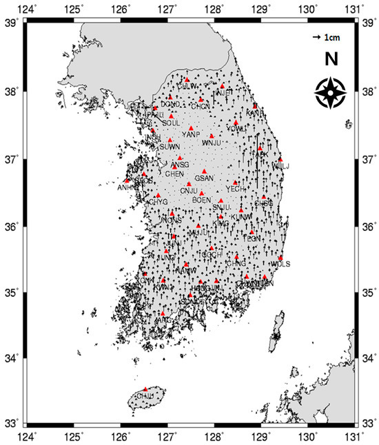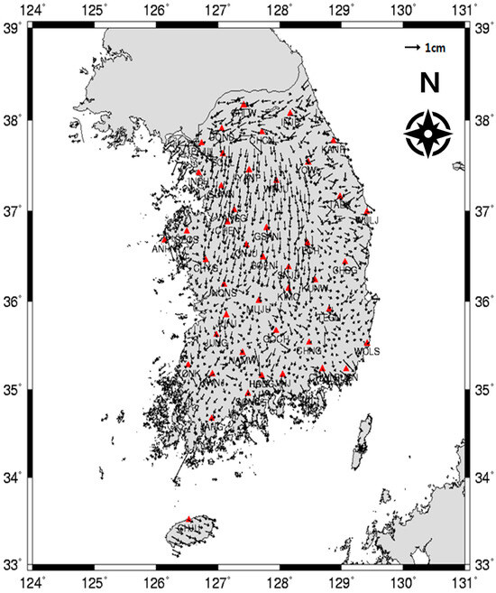 This study presented a comprehensive nationwide adjustment of South Korea’s unified geodetic control network, encompassing approximately 5560 multi-purpose control points (MPCs) established between 2008 and 2021. A unified adjustment methodology was developed by fixing 17 rigorously validated permanent GNSS stations selected for their long-term observational continuity, antenna stability, and uniform geographic distribution. The adjustment was conducted using annual GNSS observation data within the ITRF2014 reference frame and processed through the GAMIT/GLOBK software suite [44,46,47,53].