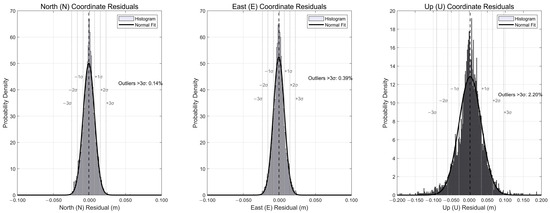 Table 8 presents the coordinate residual statistics after applying a 3-sigma outlier filtering process. The RMSE and standard deviation values for all three components—east, north, and up—are substantially reduced compared to the unfiltered results shown in Table 7. This improvement demonstrates that a small number of extreme residuals had a significant impact on the original statistics. After filtering, the RMSE values were reduced to 0.79 cm (east), 0.50 cm (north), and 1.93 cm (up), with corresponding standard deviations of 0.5 cm, 0.48 cm, and 1.93 cm, respectively. The residual ranges are now tightly constrained, with maximum values not exceeding 2.48 cm (east), 2.35 cm (north), and 9.46 cm (up).
