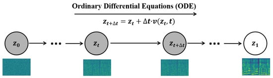 Once the predicted vector field is obtained, a continuous transformation path from the initial distribution to the target distribution can be constructed by solving the corresponding ordinary differential equation (ODE). This ODE can be numerically solved by using the Euler method, as shown in Equation (2).