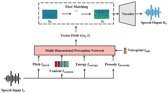This section introduces the proposed voice conversion algorithm, Multi-Dimensional Perception Flow Matching. The overall architecture of the MPFM-VC model is illustrated in Figure 3. In addition to the content features, , extracted from the input speech, the model also incorporates auxiliary features, such as pitch (), energy (), and prosody (), to generate the target mel spectrogram, , that corresponds to the speaker’s voiceprint, . We provide a detailed explanation of the core components of the proposed model in the following, including flow matching for multi-dimensional perception, the multi-dimensional perception network, the content perturbation-based training enhancement method, and the adversarial training mechanism based on the voiceprint.