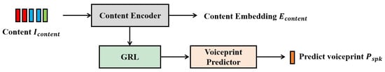 As illustrated in Figure 7, the overall adversarial training framework consisted of three main components: the content encoder () from the flow-matching module, a gradient reversal layer (GRL), and a speaker classifier (). Specifically, within the acoustic model, the input content representation, , was first processed by the content encoder, , to generate a speaker-independent content embedding: