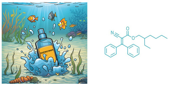 OC is widely used in sunscreens and is highly persistent in aquatic environments due to its strong lipophilicity (log Kow = 6.88). It has been detected in a wide range of water sources, including swimming pools, tap water, treated and untreated sewage effluents, and surface waters such as rivers, lakes, and seas. Reported concentrations range from 12 to 38 μg L−1 [2,3,4]. The presence of UV filters like OC in aquatic environments has raised concerns about potential risks to human health and ecosystems (Figure 1).