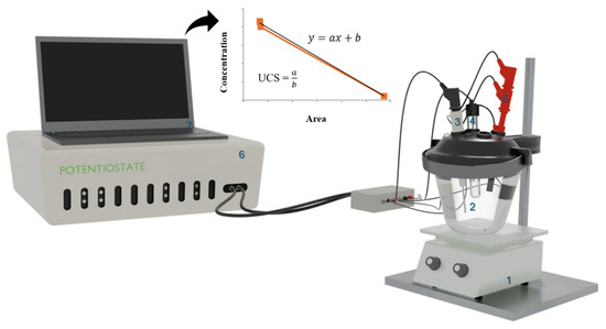 The electroanalytical setup used for quantifying OC in NaCl solutions and swimming pool water samples by the standard addition method consisted of the following components: (1) stirring plate, (2) electrochemical cell, (3) counter electrode, (4) reference electrode, (5) working electrode, (6) potentiostat/galvanostat, and (7) computer.