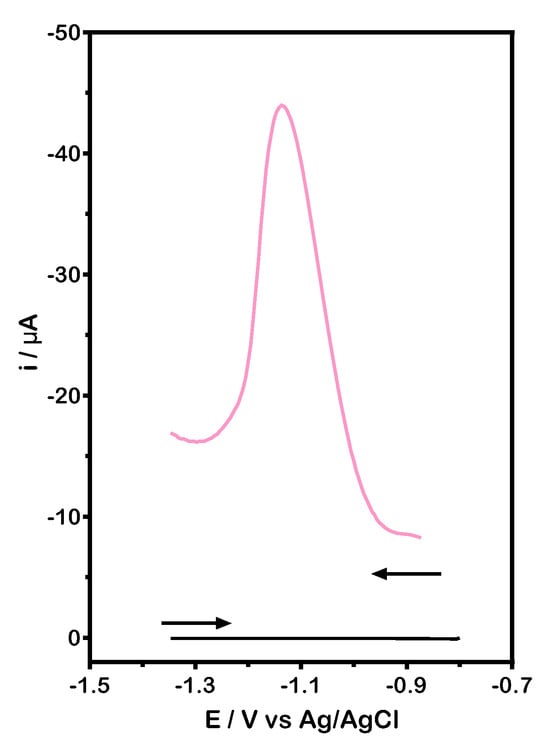 DPV profile recorded in BR buffer (0.04 M, pH 6.0): (black line) blank; (pink line) 1.00 ± 0.15 mg L−1 of OC in BR buffer. Experimental conditions as described in the experimental section.