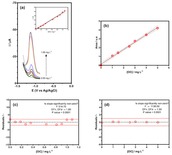 OC calibration curves: (a) DPV profiles recorded in BR buffer (0.04 M, pH 6.0) for various OC concentrations: 0.00; 0.09; 0.18; 0.27; 0.36; 0.63; 0.81; 0.90; 0.99, and 1.08 mg L−1; inset: current peak intensity as a function of OC concentration; (b) chromatographic responses recorded in BR buffer (0.04 M, pH 6.0) for OC concentrations: 0.00; 1.00; 1.50; 2.50; 3.00; 4.00, and 6.00 mg L−1; (c) weighted residuals from electroanalytic measurements; (d) weighted residuals from chromatographic responses.