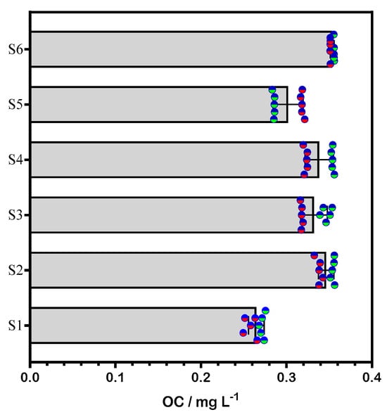 When a real water matrix was used, no significant variations were found, indicating that the GCS could serve as an effective measuring tool. As shown in Figure 5, OC concentration values obtained from both chromatographic and electroanalytic methods were closely aligned, demonstrating that there were no discernible differences in their applicability for detecting and quantifying OC in sunscreen formulations. Based on these results, DPV analysis with the GCS proves to be a suitable method for determining OC concentration in swimming pool water.