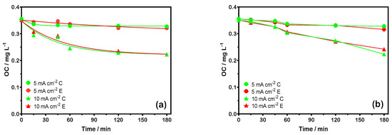 Analysis of OC degradation at 5 and 10 mA cm−2 using BDD electrolysis via chromatography (C) and electroanalysis (E): (a) swimming pool water and (b) 0.002 M Cl− solutions.
