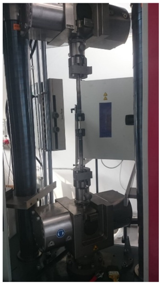 In this study, an AA 7075-T6 aluminum alloy was selected as the test material. The chemical composition of the alloy is presented in Table 1. Tensile tests were conducted at room and elevated temperatures to obtain the mechanical properties required for the finite element simulations. These tests were carried out at five different temperatures: room temperature (RT), 100 °C, 200 °C, 300 °C, and 400 °C, using a Zwick/Roell universal testing machine. The crosshead speed during testing was maintained at 1.0 mm/min. A visual representation of the testing setup is shown in Figure 1. All specimens were prepared and tested by EN ISO 6892-1 [32] and EN ISO 6892-2 [33] standards.