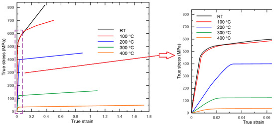 True stress–true strain curves of AA 7075-T6 at RT, 100 °C, 200 °C, 300 °C, 400 °C.