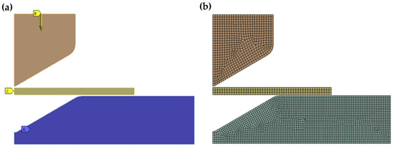 Finite element validation model of V-shaped bending. (a) Meshed model. (b) Boundary conditions of the model.