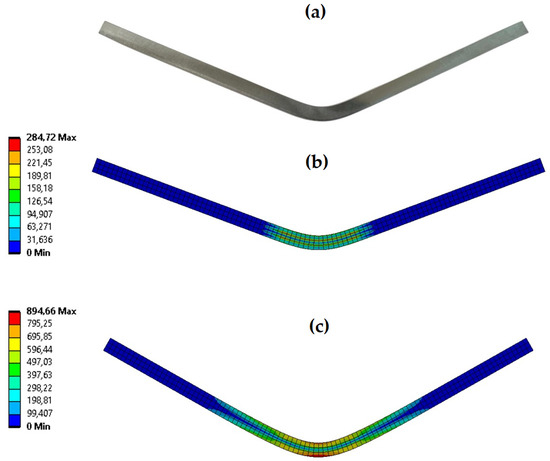 Test and simulation results. (a) Specimen view of the aluminum plate after the V-shaped bending test, (b) von Mises stress distribution of the FE model after the springback, (c) von Mises stress distribution of the FE model before the springback.