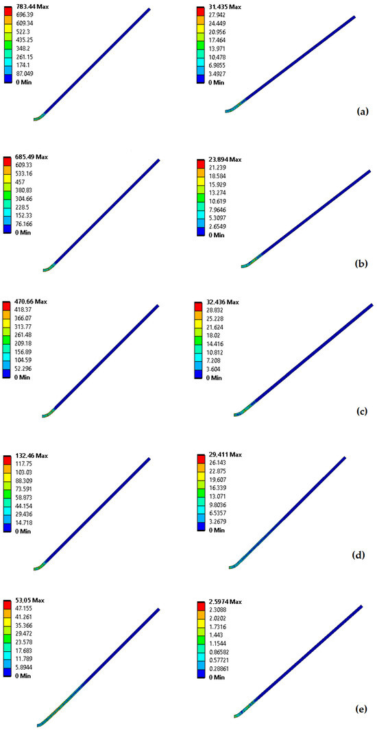 Aluminum alloys are significantly affected by high temperatures. The mechanical properties of aluminum at elevated temperatures are reduced considerably. Temperature effects are significant for machine parts operating at high temperatures and deformation operations. In this section, the results of V-shaped bending analyses performed at room temperature, 100 °C, 200 °C, 300 °C, and 400 °C, will be presented. Von Mises stress distribution of sheet metal at RT, 100 °C, 200 °C, 300 °C, and 400 °C is given in Figure 7 obtained from FE analyses. It was observed that the maximum von Mises stress in the sheet metal decreased as the temperature increased (Figure 7). While a focus of 783.44 MPa occurred at room temperature, the stress decreased to 53.05 MPa at 400 °C. Maximum von Mises stress occurred at the middle section of V-shaped bending specimens. It is observed that the stress values decreased significantly after springback [17,37]. While 783.44 MPa stress occurred before springback at room temperature, this value decreased to 31.43 MPa after springback. At 400 °C, the values before and after springback were 53.05 MPa and 2.59 MPa, respectively.