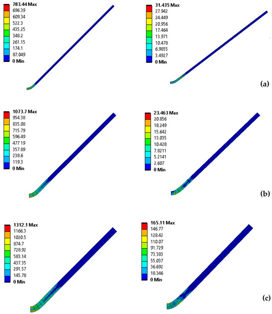 Von Mises stress distribution of sheet metal of different thicknesses before and after springback: (a) t = 1 mm, (b) t = 2 mm, (c) t = 3 mm.