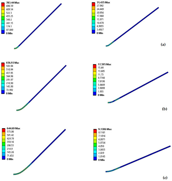 Figure 12 shows the sheet metal’s von Mises stress distribution of different bending radii. As the bending radius increases, the bending load becomes more accessible and decreases. It was observed that the degree of springback increased as the bending radius increased [45,48]. When V-shaped bending is performed with a bending radius of 4 mm, the maximum bending load is 2318 N, while when the bending radius is 12 mm, the bending load is reduced by 14% to 322 N. It has been reported in many studies in the literature that the springback angle increases linearly with the increase in the bending angle [30].