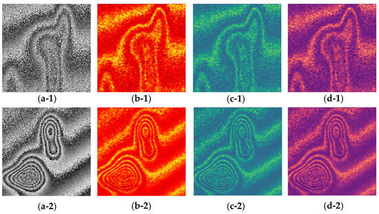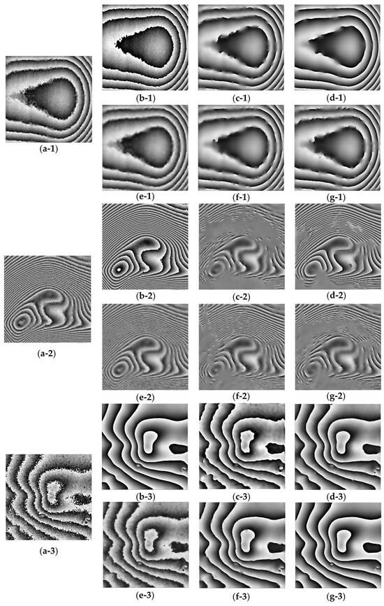 The acrylic sample, characterized by a relatively smooth and reflective surface, exhibited clear and continuous wrapped-phase fringes with a moderate noise level. The experimentally acquired noisy wrapped-phase image, having an SNR of 6.57 dB, is shown in Figure 10(a-1). The denoised results are presented in Figure 10(b-1–g-1), using WPD-Net, AD-CNN, LGCT-Net, DBDNet, DBDNet2, and LRDUNet, respectively. The WPD-Net output shows the highest quality restoration with improved clarity and reduced noise, while other methods leave visible residual noise or artifacts.