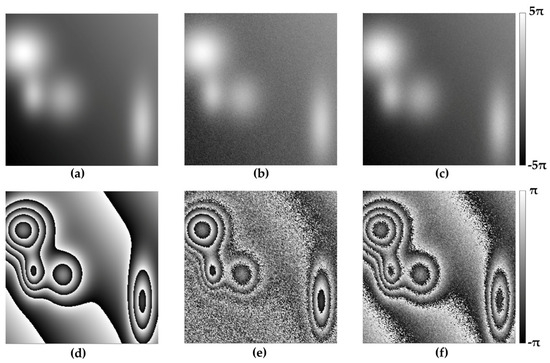 Example of synthetically generated data. The true phase image is presented (a) without noise, (b) with speckle noise, and (c) with Gaussian noise. The corresponding wrapped-phase images are shown (d) without noise, (e) with speckle noise (variance = 0.1), and (f) with Gaussian noise (SNR 5 dB). Each image consists of 256 × 256 pixels.