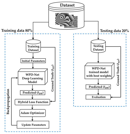 The training was conducted on a workstation equipped with an Intel i7-8700K CPU, NVIDIA GeForce RTX 2080Ti GPU, and 112 GB of RAM. The network was implemented in Keras using Python 3.7.13. Training and testing procedures for WPD-Net are illustrated in Figure 4. Each synthetic dataset consisted of 5000 wrapped-phase images (size 256 × 256), with phase values distributed in a range of [−5π, 5π]. These datasets were designed to simulate three different noise conditions: