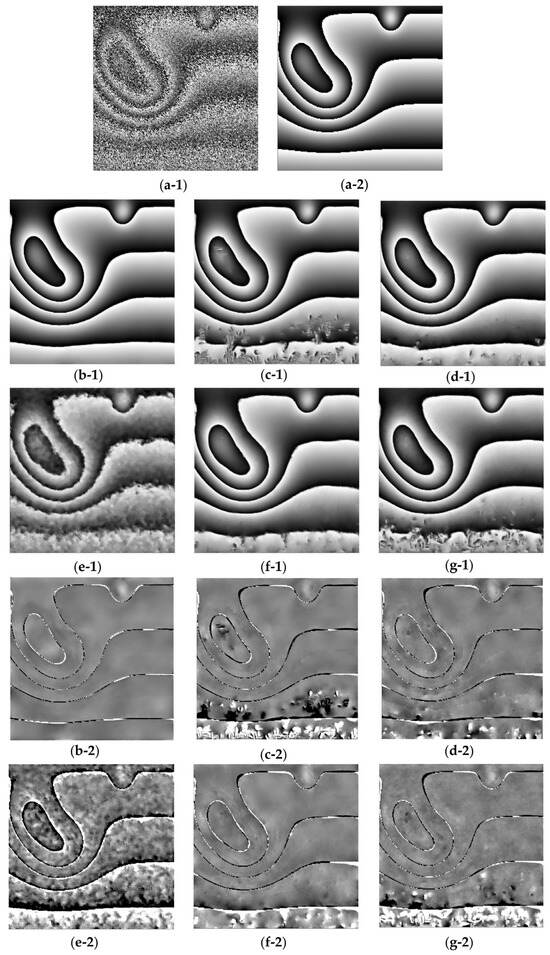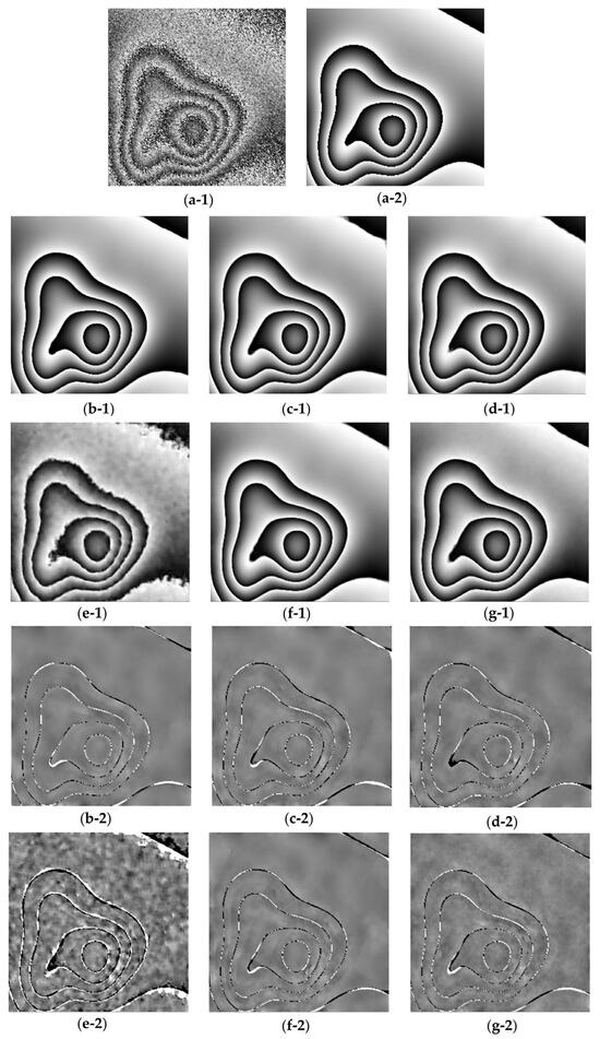 A similar comparison is performed for Gaussian noise with an SNR of 0 dB, as shown in Figure 8(a-1), with its corresponding clean noise-free image in Figure 8(a-2). The results denoised with other various methods are displayed: WPD-Net (Figure 8(b-1)), AD-CNN (Figure 8(c-1)), LGCT-Net (Figure 8(d-1)), DBDNet (Figure 8(e-1)), DBDNet2 (Figure 8(f-1)), and LRDUNet (g-1). Their respective difference maps are shown in Figure 8(b-2–g-2). Due to the significant intensity fluctuations caused by Gaussian noise, DBDNet and LGCT-Net show limitations in restoring phase continuity, resulting in visible artifacts. In contrast, WPD-Net and other networks achieve more effective noise reduction, ensuring improved phase consistency and reduced intensity distortion, as reflected in the corresponding difference maps.