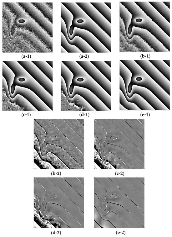 Visual results of the ablation study comparing different architectural and training configurations of WPD-Net. (a-1) Noisy wrapped-phase input image; (a-2) ground truth; (b-1) denoised result using only MSE loss; (c-1) result with RDABs but without the DFF module; (d-1) output from the model with residual dense blocks (RDBs) and no attention; (e-1) output from the complete WPD-Net with SFE, RDABs, DFF, and dynamic hybrid loss. Corresponding difference maps with respect to ground truth are shown in (b-2–e-2).