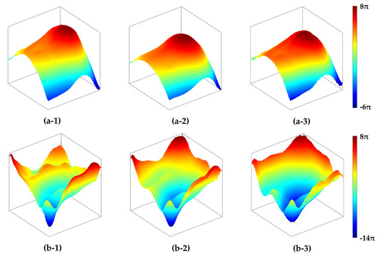 3D surface plots of the phase images unwrapped from the inputs shown in Figure 10(a-1,a-2). For the acrylic sample: (a-1) result obtained using WPD-Net denoising followed by a simple 2D phase unwrapping algorithm, (a-2) result from DenSFA-PU, and (a-3) result from U2-Net. For the PDMS sample: (b-1) result from WPD-Net with basic unwrapping, (b-2) result from DenSFA-PU, and (b-3) result from U2-Net result.