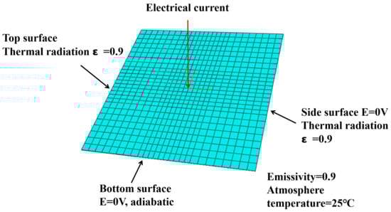 The composite laminate model established in this study measured 100 mm × 100 mm, with individual ply thicknesses of 0.2 mm and a layup sequence of [45/0/– 45/90]2S, totaling 16 plies, as depicted in Figure 1. The mesh was generated using DC3D8E elements, which are eight-node linear electro-thermal coupled hexahedral elements; a mesh convergence analysis was conducted by progressively refining the mesh density until the temperature field and damage area predictions stabilized. The optimal mesh size was determined when further refinement produced a less than 2% change in the predicted maximum temperature and damage area. An implicit solver (Abaqus/Standard) was used in the simulation. To enhance the simulation accuracy and precisely model local effects, the mesh was locally refined in the central region, resulting in a total of 33,728 elements. Based on the operating conditions described in the experiment, precise electrical and thermal boundary conditions were applied during the simulation. The side and bottom surfaces of the specimen were in full contact with the metal components of the experimental apparatus, ensuring effective grounding. Consequently, the electric potential for the side and bottom surfaces was set to 0 V. Due to Joule heating, significant temperature increases occurred along the current flow paths, leading to substantial temperature differences between the top and side surfaces and the environment. Therefore, a third-type boundary condition with a thermal emissivity of 0.9 was applied. The bottom surface of the laminate exhibited minimal temperature variation and was treated as adiabatic, employing a second-type boundary condition with the ambient temperature set to 25 °C, considering the short duration of lightning strikes and the limited heat diffusion to the bottom layer.