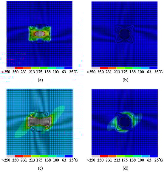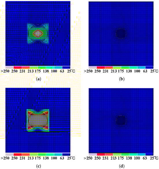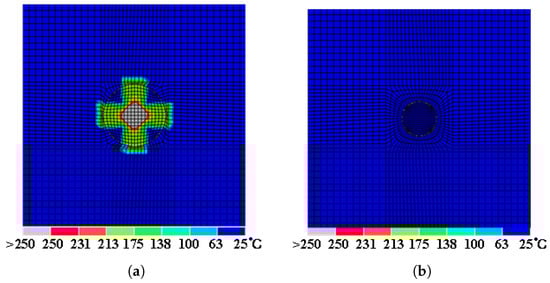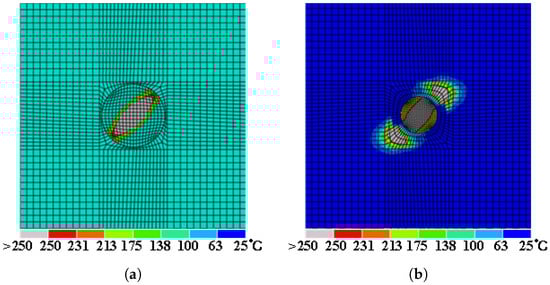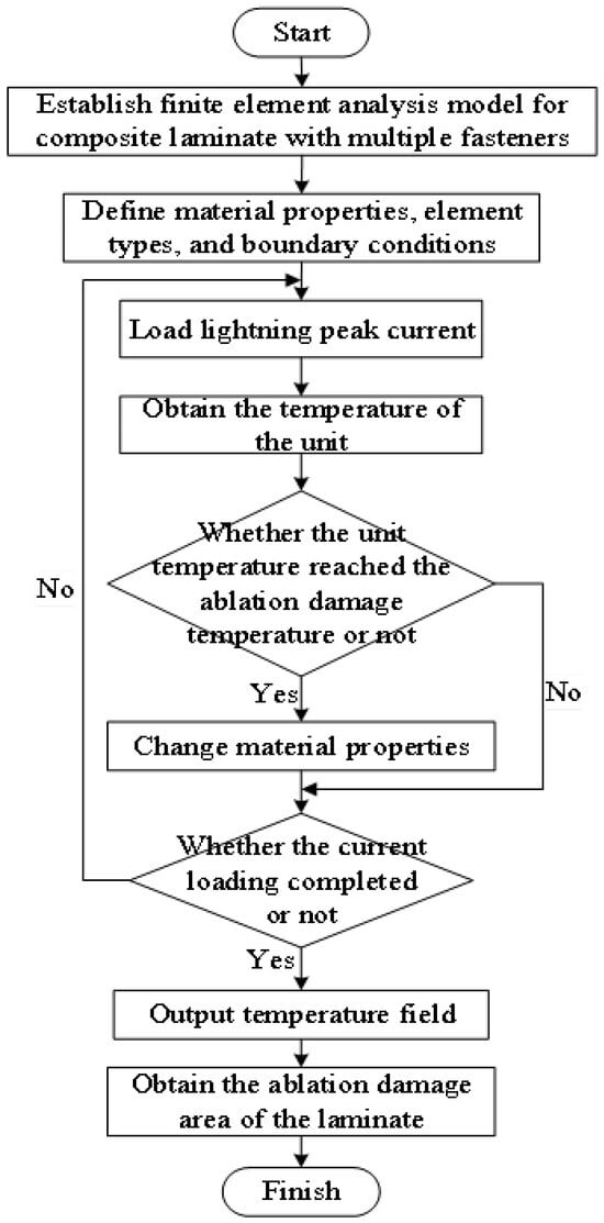 The electro-thermal coupling analysis method is a multiphysics simulation technique utilized to delineate the damage state of materials by simulating the temperature field distribution, thereby predicting the extent of damage and informing the design of repair measures. Lightning-induced damage is conducted using the Abaqus FEA software, as shown in Figure 3. The detailed components of this analysis have been previously described in Section 2, including mesh generation and boundary conditions (Section 2.2.1), material properties (Section 2.2.2), and current load (Section 2.2.3). In the initial step, the potential subjected to lightning current is computed under prescribed electrical boundary conditions, while transient heat transfer is performed by applying the generated Joule heat to each finite element under given thermal boundary conditions. The analysis incorporates temperature-dependent material properties, with full coupling between electrical and thermal analyses. Phase changes due to temperature increases are monitored for ablation damage indicators. If an element reaches the critical temperature, its properties are adjusted; otherwise, they remain unchanged. The final temperature distribution identifies ablation areas.
