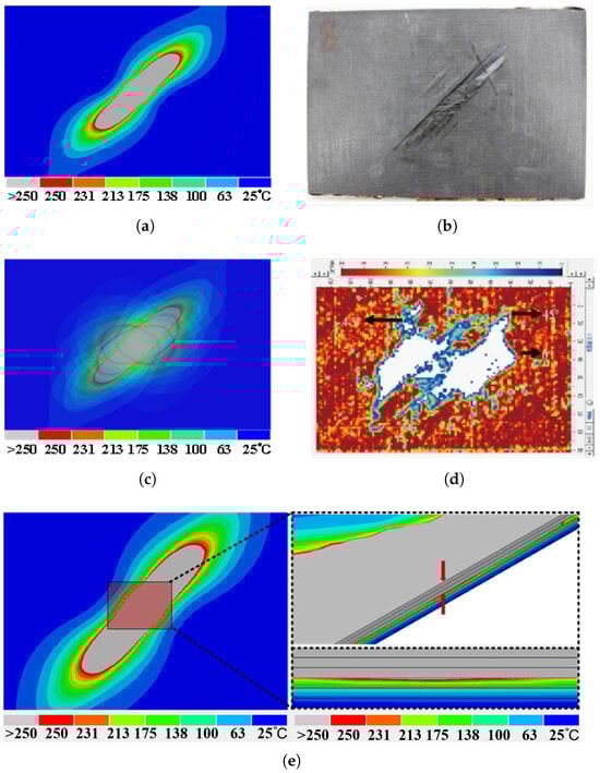 Verification of the validity of finite element models. (a) External damage by simulations (ablation damage indicated in gray); (b) external damage by experiments []; (c) internal damage by simulations; (d) internal damage by C-scan test []; (e) damage depth by finite element model (ablation damage indicated in gray).