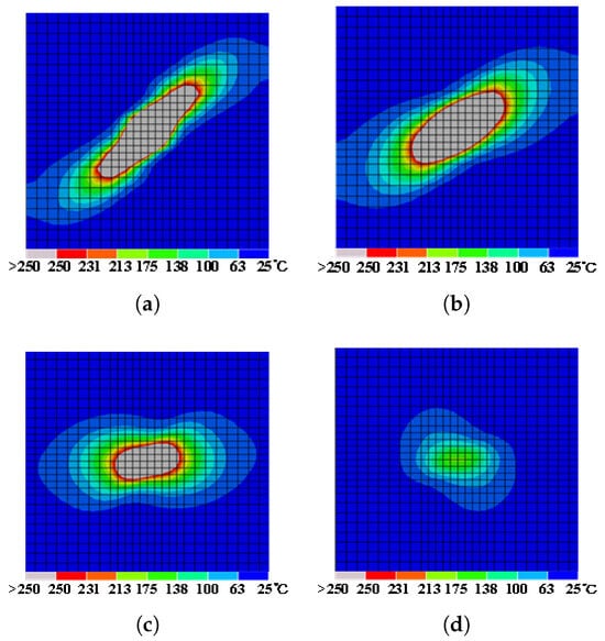 When assessing the lightning-induced damage in CFRP composites, the material’s phase transition behavior at specific temperatures significantly alters its physical properties, thereby influencing the distribution of heat within the material. Non-uniform thermal distribution can result in localized overheating and subsequent damage. Ogasawara et al. [] extensively investigated the behavior of carbon fibers and epoxy resin matrix in CFRP at various temperatures using thermogravimetric analysis (TGA), providing specific temperature thresholds for damage determination. When lightning strikes induce high temperatures, the thermal behavior of CFRP can be delineated into several critical stages: When the temperature rises to approximately 250–300 °C, resin begins to degrade thermally, causing localized ablation damage on the laminate. As the temperature continues to increase to about 600 °C, the resin undergoes complete thermal decomposition, leading to delamination within the laminate. Further temperature rise causes the resin to vaporize, while carbon fibers, exhibiting higher temperature resistance compared to the resin, decompose at approximately 3000 °C. Beyond this temperature, dielectric breakdown occurs at interlayer gaps, causing a sharp increase in through-thickness electrical conductivity. As carbon fibers fracture due to decomposition, Joule heating is prevented. Therefore, areas with temperatures exceeding 250 °C are considered to have experienced ablation damage due to the thermal degradation of epoxy resin.
