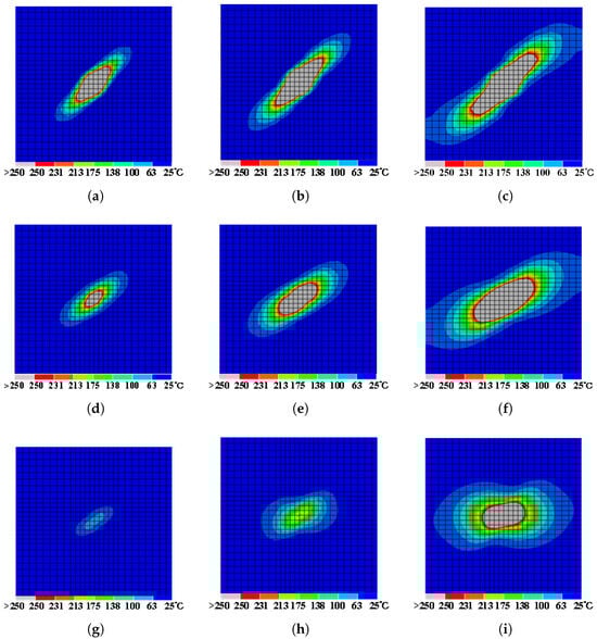 When subjected to a lightning current with an 8/20 µs and a peak value of 20 kA, the temperature variation predominantly affects the initial four plies of the laminates. Among these, the ablation damage is predominantly concentrated in the top three plies, corresponding to areas where temperatures exceed 250 °C, as illustrated in Figure 5a–c, with no significant ablation damage observed in the fourth ply and those below.