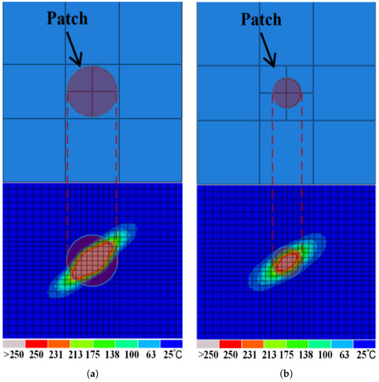 In the current study, a simulation model was developed for the patch repair process of damaged regions in laminate composites. This model employs a stratified repair strategy aimed at maximizing structural integrity while minimizing unnecessary repair steps. Specifically, the repair operations in the simulation are conducted sequentially from the innermost composite ply to the outermost ply, applying patches to each ply in turn. Additionally, to address the irregular and misaligned ablation damage across different plies of the laminate, patches of varying sizes and consistent shapes were selected for the repair, in alignment with established practical methods. For ablation damage under 5 kA, minimally circumscribed circular patches were designed for the first and second layers of the damage area. Figure 7 shows a schematic of the patch assembly on the substrate laminate.