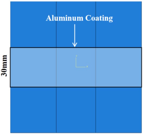 A 0.01 mm thick aluminum coating was locally applied to the geometric center of the structure along the x-axis direction, measuring 100 cm in length and 30 cm in width, as shown in Figure 9. This targeted application covered the junction, and was anticipated to enhance surface electrical conductivity. Under a 5 kA peak current, no ablation damage was observed on the surface or within the structure. This indicates that the high electrical conductivity of aluminum provides conductive pathways, potentially mitigating breaks in current flow caused by misaligned fibers at the junction, thereby enabling the structure to uniformly disperse the current and heat generated by lightning strikes.