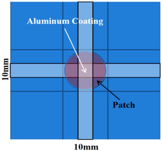 A cross-shaped aluminum coating, 10 mm in width, was applied at the geometric center of the structure’s surface. Figure 12 presents the assembly of the cross-shaped aluminum coating and the repaired structure. Upon exposure to a 100 kA peak current, the ablation damage, as depicted in Figure 13, was confined to the first ply, with an area of 1.36 mm2. This damage area represents reductions of 26.49%, 18.5%, and 74.72% compared to the groups with 30 mm, 20 mm, and 10 mm aluminum coatings, respectively. Furthermore, it is a significant 79.24% reduction compared to the uncoated controls.