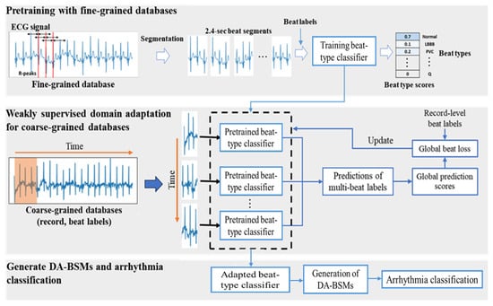 The proposed Domain-Adapted Beat-Score-Map (DA-BSM) framework is designed to address the cross-database challenges in ECG analysis, including label scarcity and domain variability. This section describes the three core components of the framework: pretraining on fine-grained databases, weakly supervised domain adaptation for coarse-grained databases, and the final arrhythmia classification step. An overview of the entire process is provided in Figure 1.