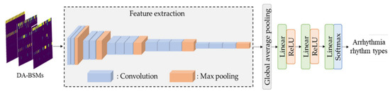 The DA-BSM generated in the preceding step is fed into a rhythm classification model trained to identify a set of rhythm types, depending on the datasets. In our experiments, these include rhythm categories such as a normal sinus rhythm (SR), atrial fibrillation (AFIB), grouped supraventricular tachycardia (GSVT), and sinus bradycardia (SB). This process utilizes the spatially structured features encoded in the DA-BSM to enhance rhythm-level classification performance.