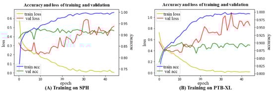Training and validation curves for the rhythm classifier using DA-BSM inputs. Left (A): SPH (4-class). Right (B): PTB-XL (binary).