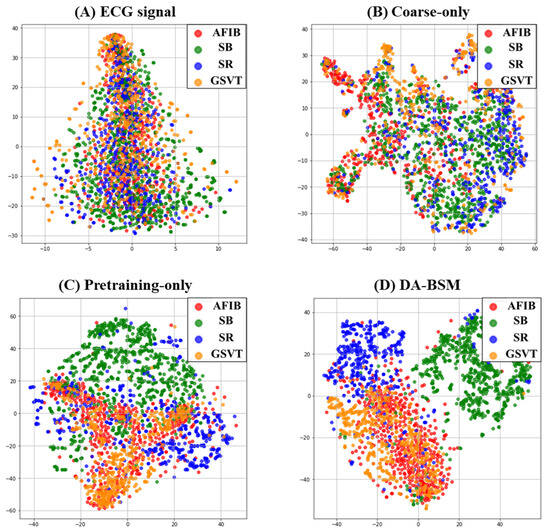 To visually demonstrate the advantages of the DA-BSM framework, Figure 6 presents the t-distributed stochastic neighbor embedding (t-SNE) [41] visualizations of the ECG data distributions at different stages of the proposed method. In this figure, panel (A) depicts the raw data distribution without any preprocessing or adaptation, where significant overlap among rhythm classes (AFIB, SB, SR, GSVT) in the ECG signals is evident. Panel (B) illustrates the limited class separation achieved by training exclusively with weakly supervised learning (WSL) on coarse-grained annotations, without pretraining. Panel (C) highlights the improved separability obtained from pretraining alone on the fine-grained MITDB dataset. Panel (D) shows significantly enhanced and clearly distinguishable rhythm clusters by the combination of pretraining and weakly supervised adaptation. These results visually underscore the effectiveness of our proposed approach in enhancing class distinction, robustness, and adaptability across heterogeneous ECG datasets.