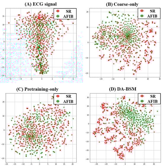 To visually illustrate the benefits of the DA-BSM framework, Figure 7 presents t-SNE visualizations of the ECG data distributions from the PTB-XL database at different stages of the proposed method. In this figure, panel (A) depicts the raw ECG data distribution without any preprocessing or domain adaptation, showing considerable overlaps between rhythm classes (SR and AFIB). Panel (B) illustrates the limited class separation obtained by training exclusively with WSL using coarse-grained annotations without pretraining. Panel (C) demonstrates the improved separability achieved by pretraining alone on the fine-grained MITDB dataset, though the overlaps between classes remain noticeable. Finally, panel (D) shows distinct and clearly separated rhythm clusters resulting from the combined application of pretraining and weakly supervised adaptation. These visual results further underscore the effectiveness of the proposed approach in enhancing class distinction, robustness, and generalization performance across heterogeneous ECG databases.