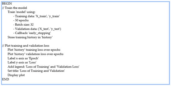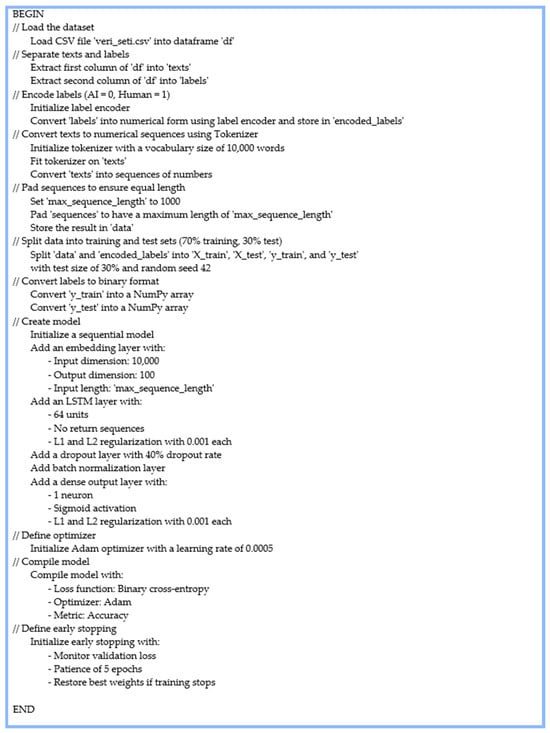 The dataset consisted of labeled sentences, categorized as either AI-generated or human-written. It was loaded from a CSV file and processed for text and label extraction. Labels were numerically encoded using LabelEncoder from the scikit-learn library, where “AI” was assigned 0 and “Human” was assigned 1. Text data were tokenized using TensorFlow’s Keras Tokenizer, configured to consider the 10,000 most frequent words. Each sentence was converted into sequences of integers, padded to a uniform length of 1000 tokens to fit the neural network input requirements. Figure 1 depicts the Pseudocode used to prepare the dataset for analysis.