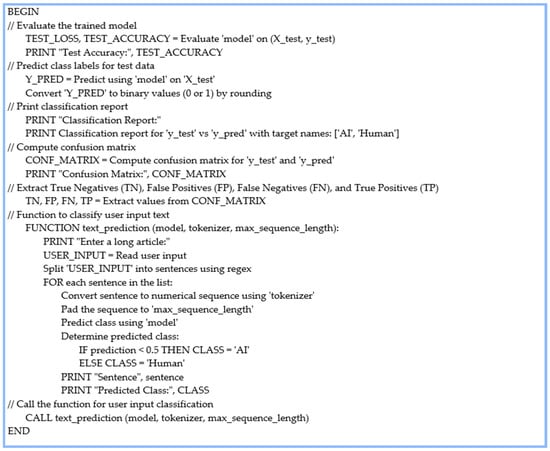 Following training, loss metrics, and accuracy were used to assess the model on the test set. A categorizing report that comprised measures like accuracy, precision, recall, F1 score, and support for each class was produced by comparing predictions made on the test data with the true labels. The distribution of true positives, true negatives, false positives, and false negatives was also examined using a confusion matrix. A user interaction module was created to display the model’s capabilities. Users could enter a sentence into this module, which would be tokenized and padded to fit the model’s input format. The model’s prediction was converted into a readable label (‘AI’ or ‘Human’) and displayed to the user. Figure 4 depicts the Pseudocode used to run the tests.