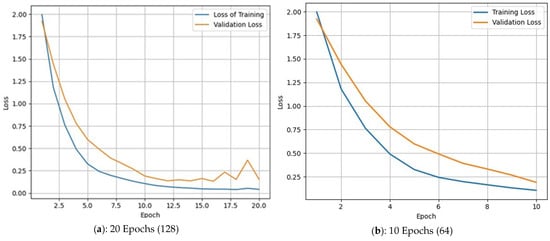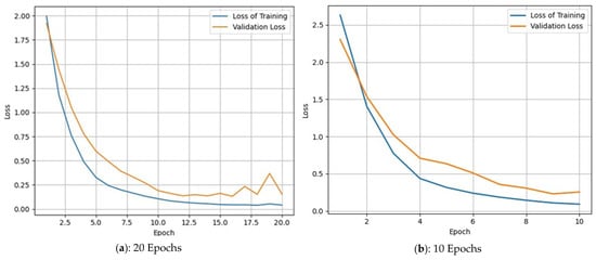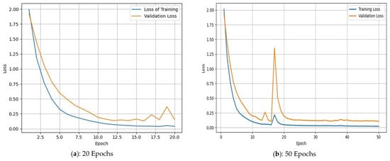 The model was trained for a total of 20 epochs and 50 epochs. Figure 5 summarizes the results of test 1 for both 20 and 50 epochs. Based on the training results, the trends in the training and validation loss graphs were similar. The gap between training and validation loss was minimal, and there was no significant increase in validation loss, indicating that the model did not overfit. The early stopping strategy ensured that training was halted when the best validation loss was achieved, further contributing to overfitting prevention. Typical signs of overfitting, such as a rapid decrease in training loss alongside an increase in validation loss, were not observed in this study. Both training and validation losses decreased in a balanced manner. When interpreting the graph, we can analyze the model’s performance by examining how the training and validation losses change per epoch. The graph shows the training loss and validation loss at the end of each epoch during training. However, during the 50-epoch training, there were imbalances and increases in the val_loss values. This suggests that the model overfitting led to a decrease in overall performance. Moreover, the 50-epoch model showed overfitting, adapting too much to the training data, which resulted in lower performance on the validation and test sets. Figure 5 depicts the training loss for test 1.