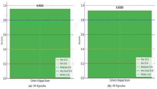 As illustrated in Figure 6, the model trained with 20 epochs achieved a Kappa metric score of 0.9542, which is notably higher than the 0.9283 attained by the 50-epoch model. This metric, which measures the agreement between predicted and actual classifications while accounting for chance agreement, provides further evidence of model reliability. The superior Kappa score of the 20-epoch model reinforces our earlier findings, confirming that a shorter training duration—when coupled with appropriate regularization and architecture settings—can lead to more effective generalization and better classification consistency. In contrast, the 50-epoch model, despite longer training, exhibited signs of overfitting, resulting in reduced agreement and lower robustness in its predictions. Overall, the 20-epoch model is more optimized, showing a more balanced performance and providing better test accuracy and loss values. Therefore, it has a higher generalization capacity. Moreover, effective use of the early stopping technique is important to prevent the model from over-learning and to determine the optimum number of epochs. Figure 6 depicts the Cohen’s kappa scores for test 1.