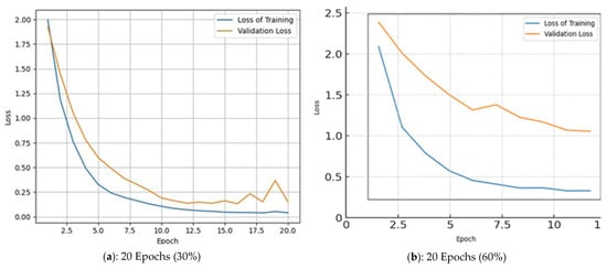 The effects of changing the test data ratio (test_size = 0.3 and test_size = 0.6) on an LSTM model were examined. The impact of this change in training and testing data ratios on the model’s accuracy, loss values, classification report, and confusion matrix were analyzed comparatively. The ratio that gives more optimized results was evaluated, and its reasons and consequences were considered. This model required fewer epochs and a faster training time. As shown in Figure 9, although the training accuracy increased at a 60% test rate, a decrease in test accuracy was observed. Low training loss and high test loss indicate that the model is over-learning. On the other hand, at a 30% test rate, training and test performances are compatible, and no signs of over-learning are observed. Figure 9 depicts the training loss for test 4.
