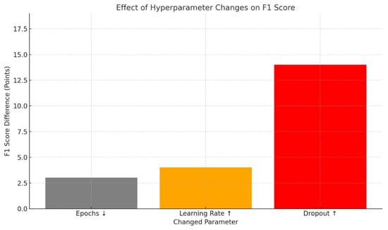 - Dropout rate impact (20% → 40%): The most pronounced effect on model performance resulted from the increased dropout rate, which increased from 20% to 40%. This adjustment led to a substantial decline of approximately 10–11 points in the F1 score, indicating that the model experienced over-regularization. High dropout rates, while effective for reducing overfitting, can excessively disrupt the learning process, limiting the model’s ability to capture complex patterns in the data. This aligns with the broader understanding that excessive dropout can degrade model capacity and stability.