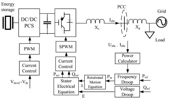 The VSM control emulates the governor’s external characteristics by establishing droop characteristics between active power and system frequency, which can be expressed as Equations (1) and (2).