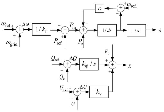 Equation (3) represents the reactive power control loop, which generates the reference internal voltage by simulating the excitation mechanism of SG.