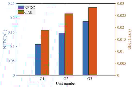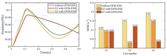 According to the simulation results, after configuring the GFM-ESS, the RoCoF of each generator decreases, with the most significant decrease observed at the unit where the GFM-ESS is installed. The decrease in RoCoF is also reflected in the change in the NFDC value, indicating a positive correlation between the NFDC and RoCoF.