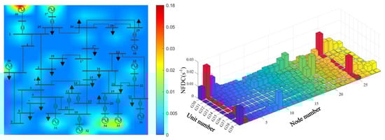 Based on the same method, the inertia distribution characteristics of the IEEE 39-bus system were evaluated. The NFDC evaluation results are shown in Figure 7.